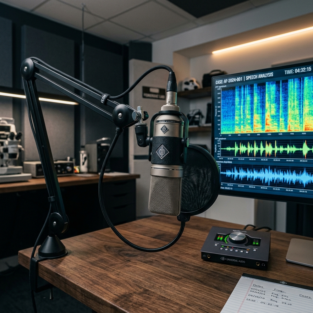 Laboratório de perícia de áudio forense analisando espectrogramas de voz complexos em 2026.